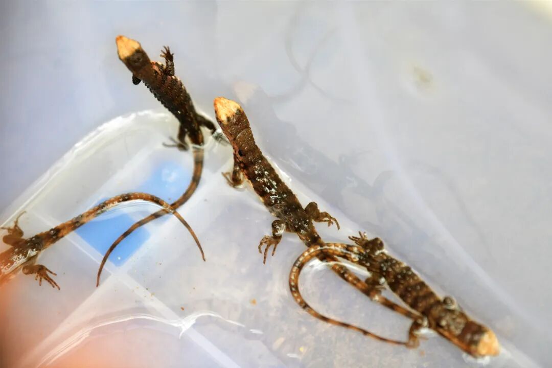 “今年3月下旬就迎来了首批新生鳄蜥,目前已成功繁育了80多只,成活率比往年高出不少。”广西大瑶山国家级自然保护区鳄蜥人工繁育基地副站长钟飞一边查看繁育池,一边向记者介绍,刚出生的鳄蜥仅拇指大小,体重2-3克,头顶带着标志性三角黄斑,一出生便能游动、觅食,展现出极强的生命力。